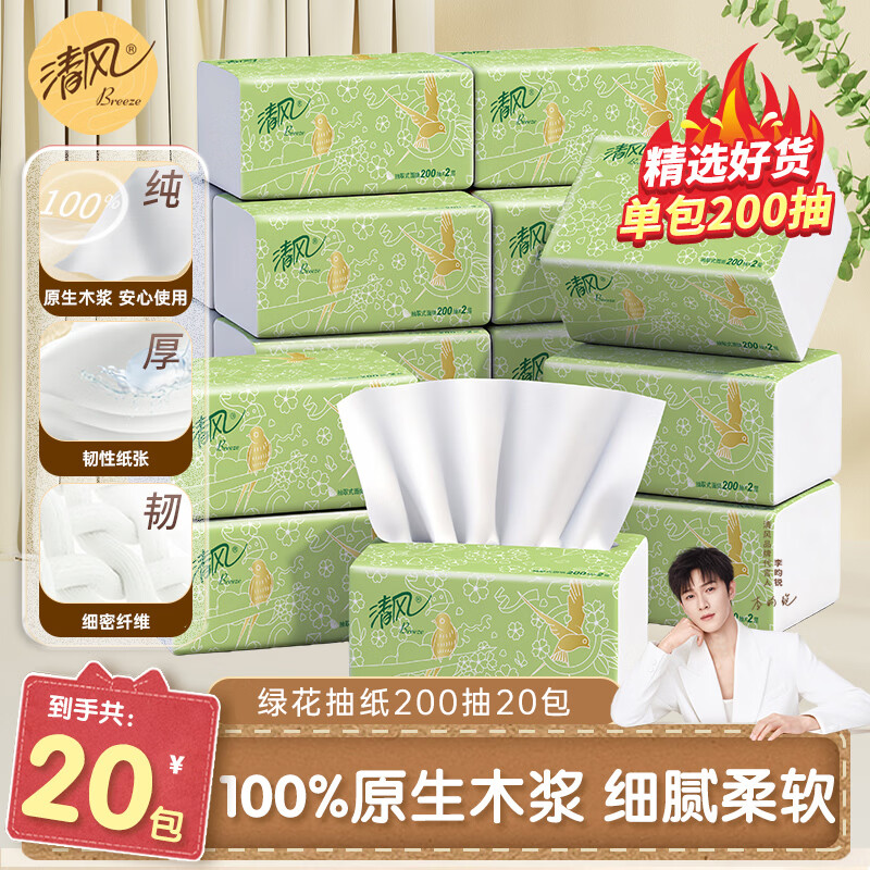 清风抽纸200抽20包 抽纸母婴卫生纸面巾纸吸水纸批发整箱装400张*20包 2层 200抽*20包 整箱装